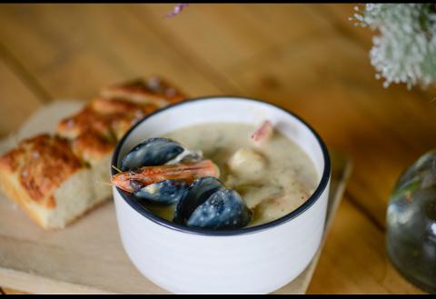 · Curry Myrtle Ghadu (Seafood) Mornay with Saltbush focaccia